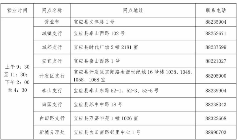 2020年2月1日至2月4日,除总行营业部、城镇支行、城郊支行、安宜支行、泰山支行、开发区支行、南园支行、白田路支行、新城分理处等9家网点外,其余各营业网点均不对外营业, 2月5日起恢复营业。具体营业网点详见下表: